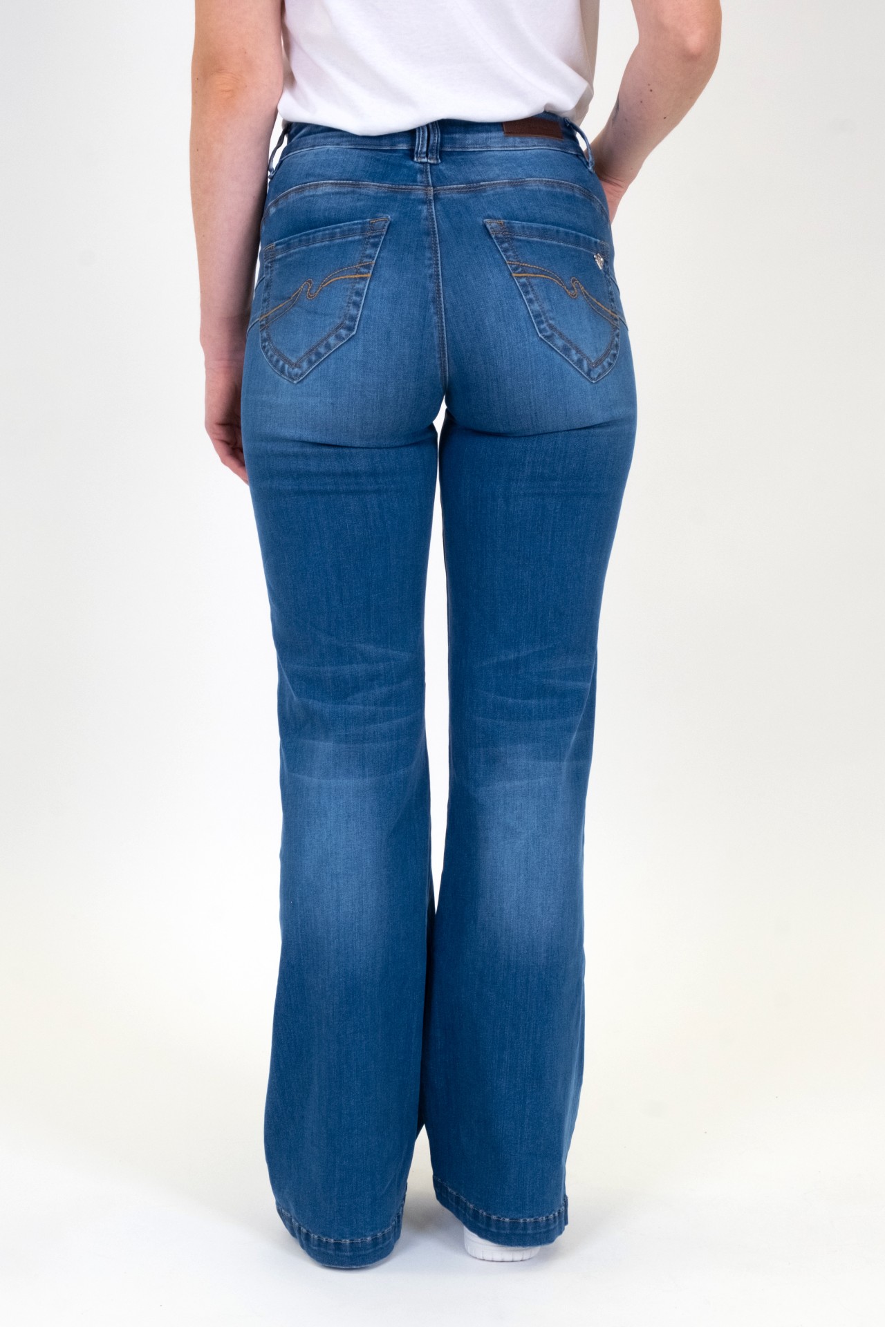 Die Blue Monkey Jeans Lina ist ein Flared Style mit ausgestelltem Bein. Geschwungene Stickereien auf den Gesäßtaschen setzen Akzente.