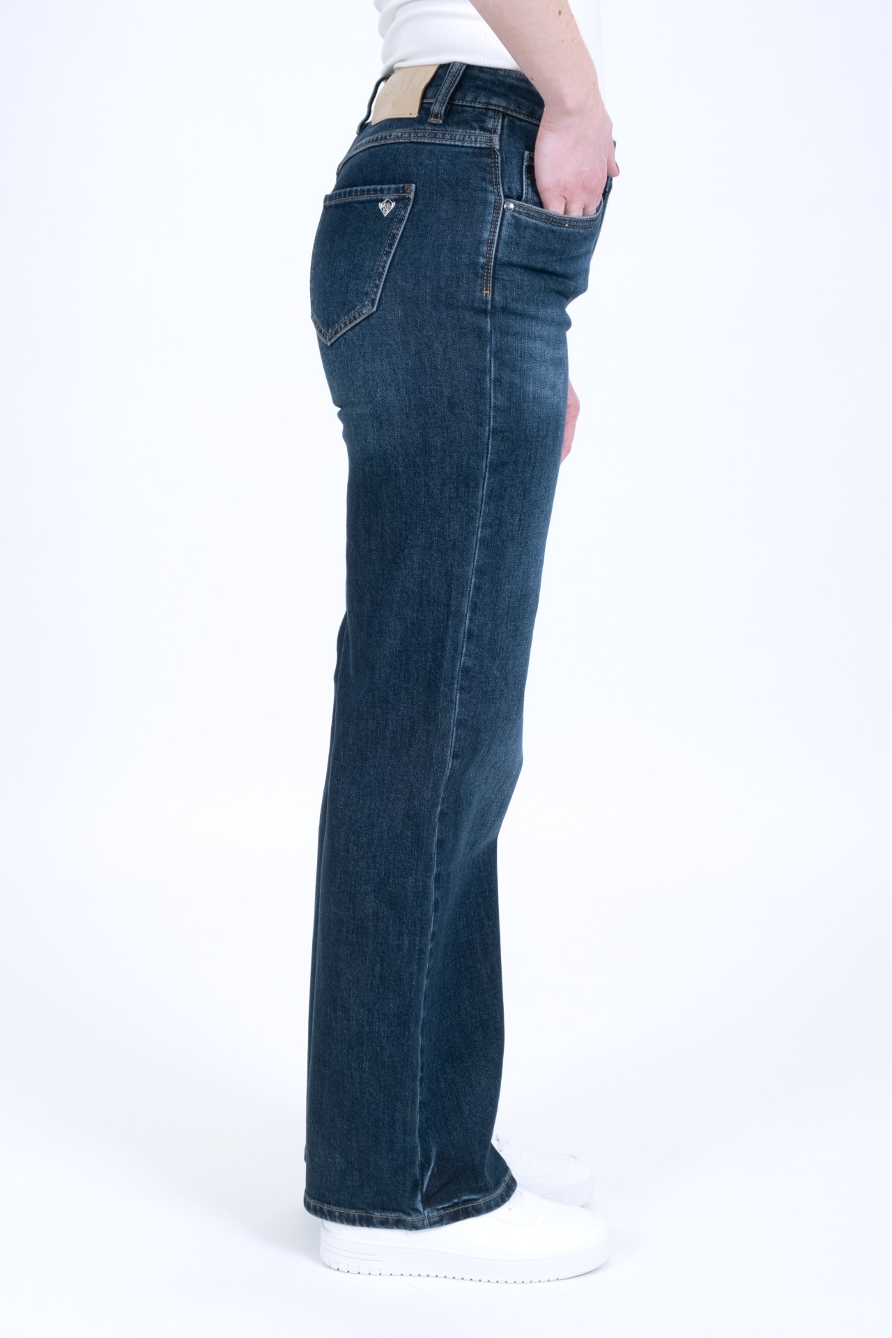 Die Blue Monkey Jeans Zoe kommt im Wide Leg Style. Sie ist eine modische 5-Pocket-Jeans mit mittlerer Leibhöhe. Der weite, gerade Beinverlauf streckt optisch das Bein und wirkt besonders figurschmeichelnd.