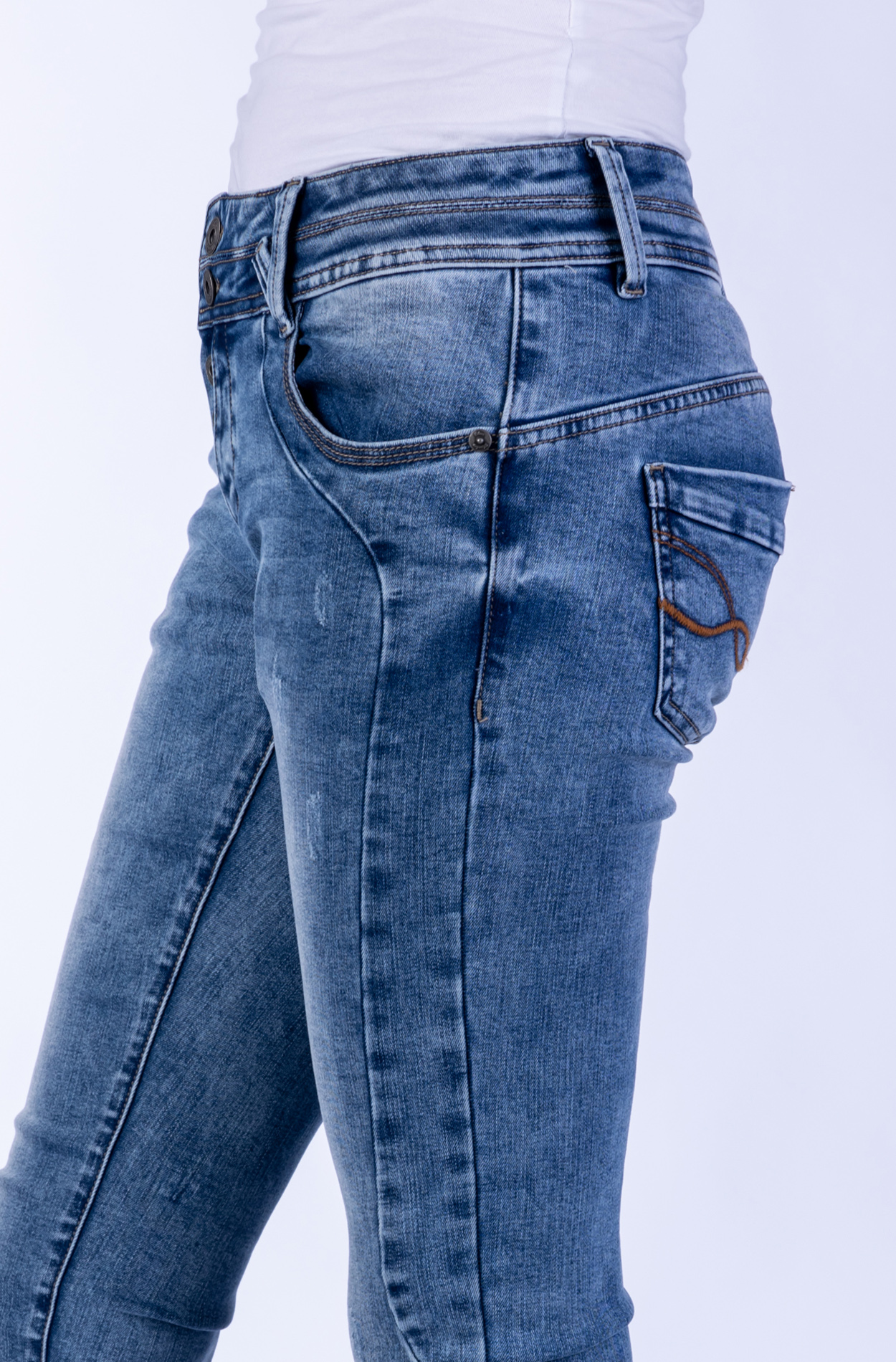 Der Blue Monkey Klassiker Anny ist eine Skinny Fit Jeans mit mittlerer Leibhöhe. Die raffiniert verarbeitete Knopfleiste ist charakteristisch für dieses Modell. Die geschwungenen Seitennähte sorgen für eine feminine Silhouette. Durch die tief sitzenden Gesäßtaschen wirkt die Jeans besonders figurschmeichelnd. Die Blue Monkey Jeans überzeugt durch aufwendig verarbeitete Details und authentischer Waschung im Used-Look.