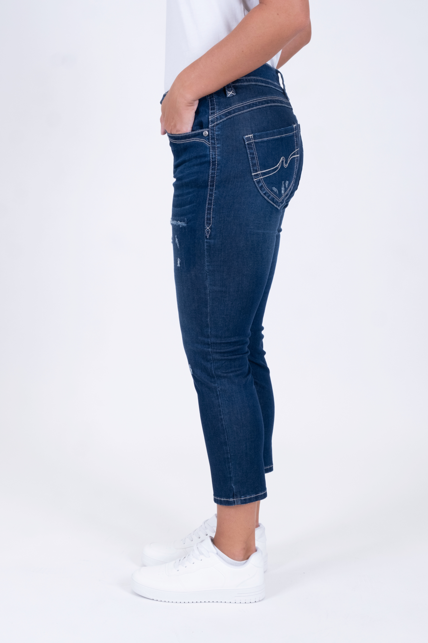 Der Blue Monkey Sommer-Liebling Charlotte gehört in jeden Kleiderschrank! Die 7/8 Jeans ist figurbetont geschnitten und überzeugt mit Shaping-Effekt, welcher durch angeschrägte Gesäßtaschen erzeugt wird. Detailverliebte Näht & Stickereien unterstreichen den femininen Touch. Mit ihrer dunkelblauen Waschung und destroyed Details, wird die Jeans zur perfekten Basis für einen stylischen Sommerlook.