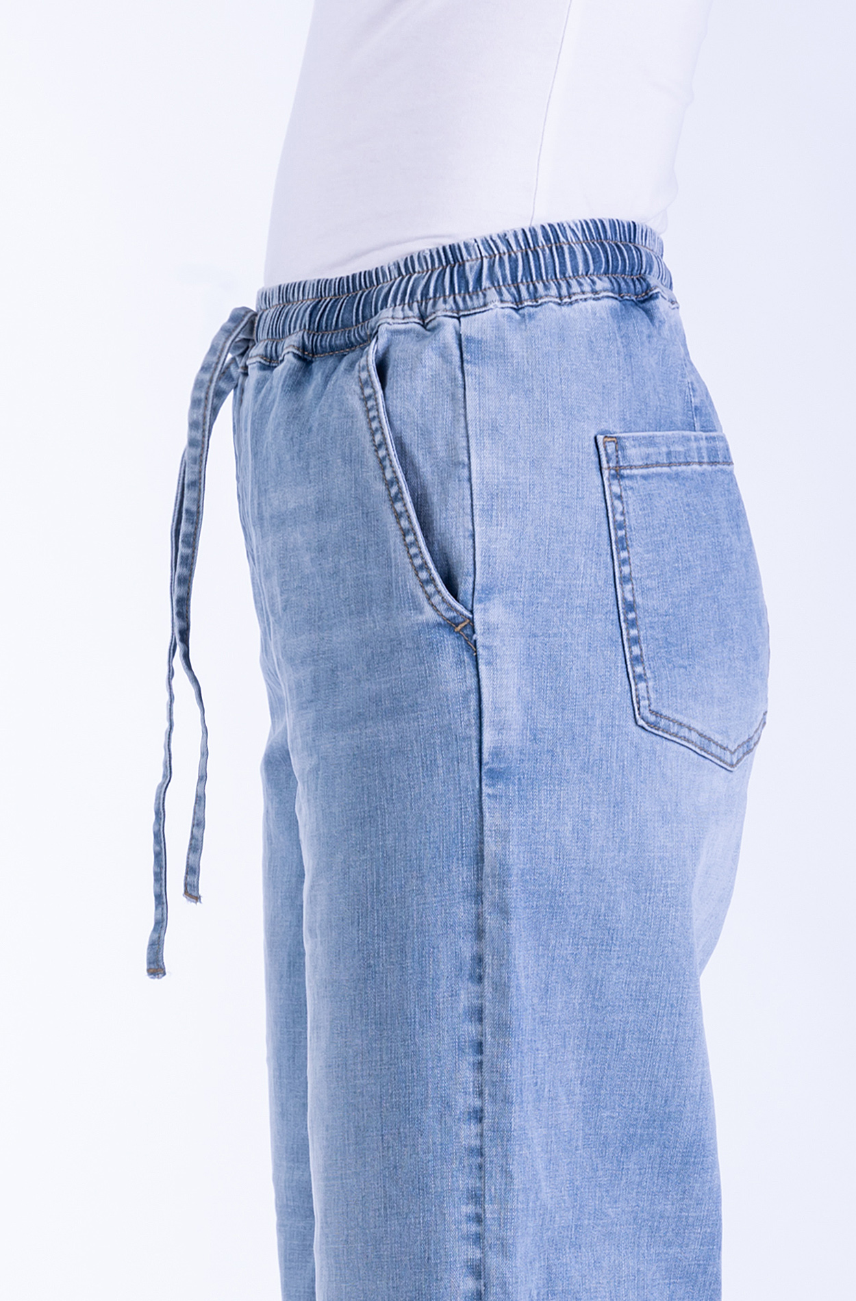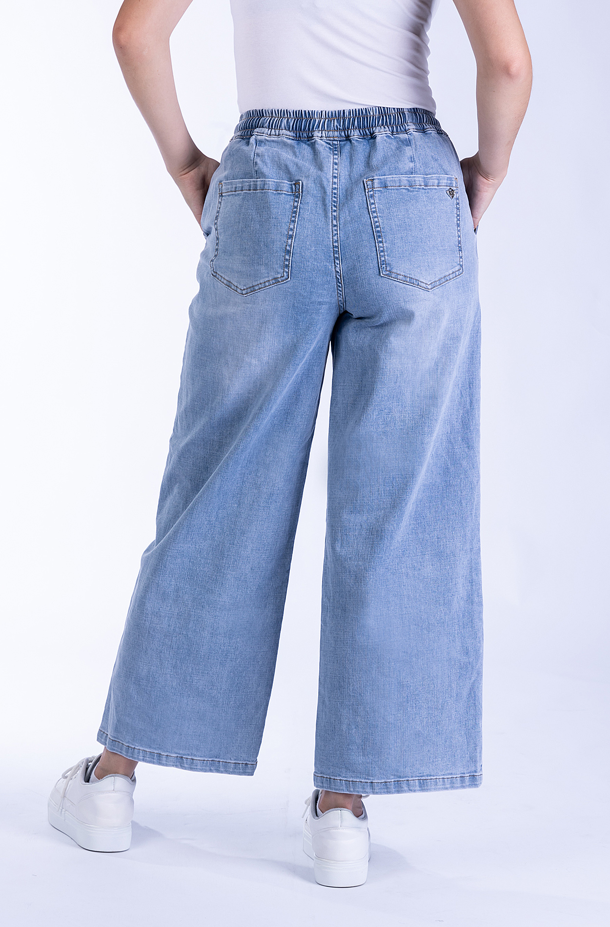 Die Blue Monkey Wide Leg Jeans Sara überzeugt mit verstellbarem, elastischem Bund und Kordelzug. Das leicht ausgestellte Bein setzt modische Akzente. Die Jeans ist in der verkürzten Cropped Variante oder in normaler Beinlänge erhältlich.