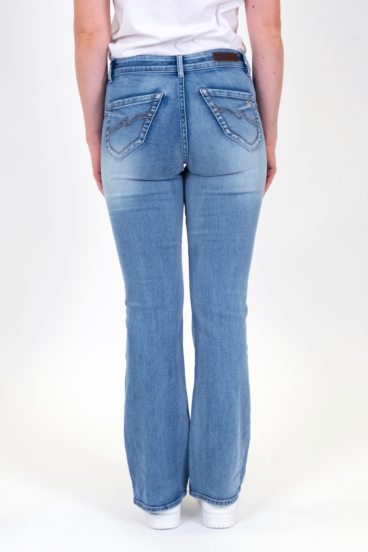 Die Blue Monkey Jeans Mia ist ein femininer Bootcut Style mit leicht ausgestelltem Bein. Geschwungene Stickereien auf den Gesäßtaschen setzen Akzente. Die Jeans kommt mit aufgesetzten Fronttaschen und ist aus weichem Denim.