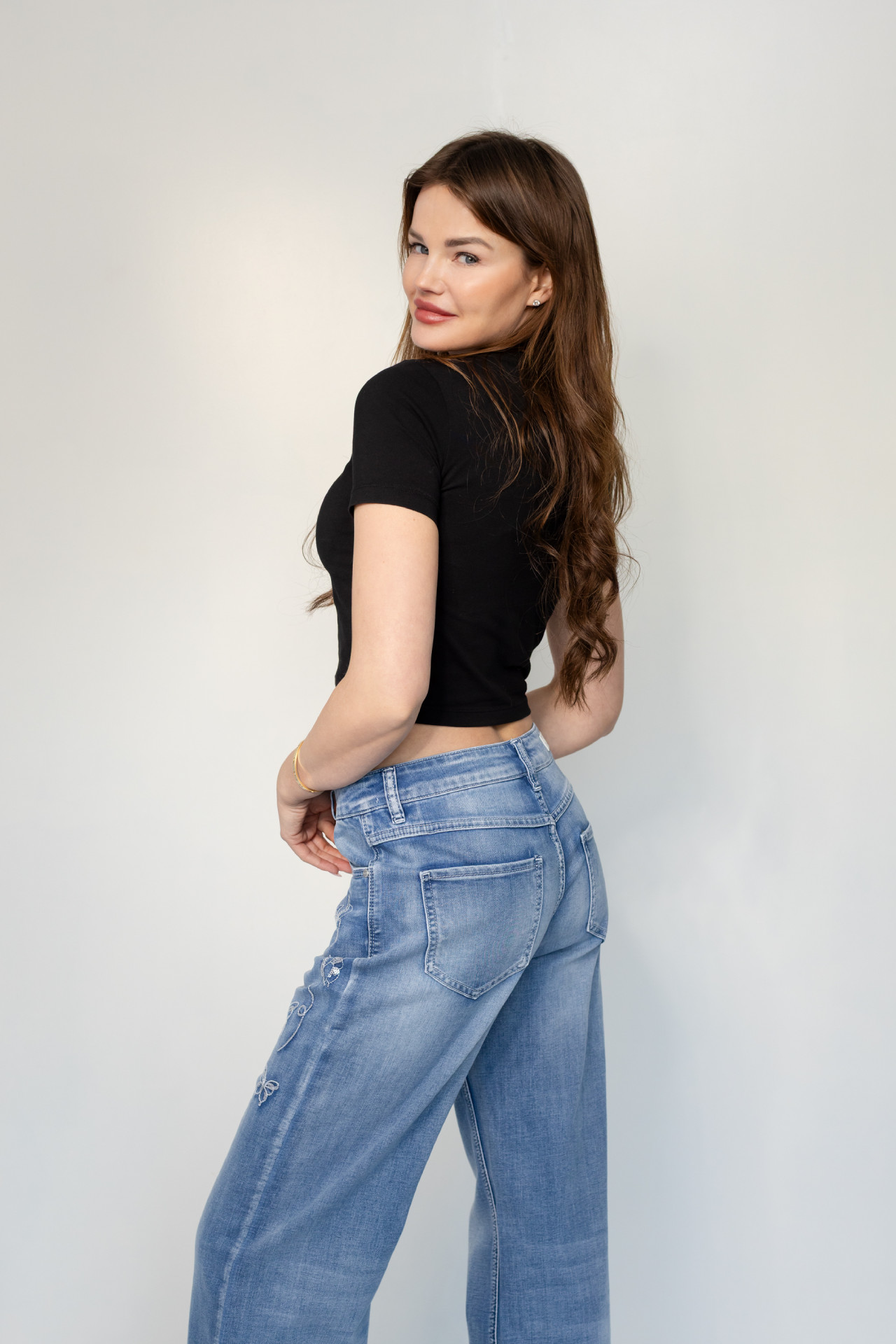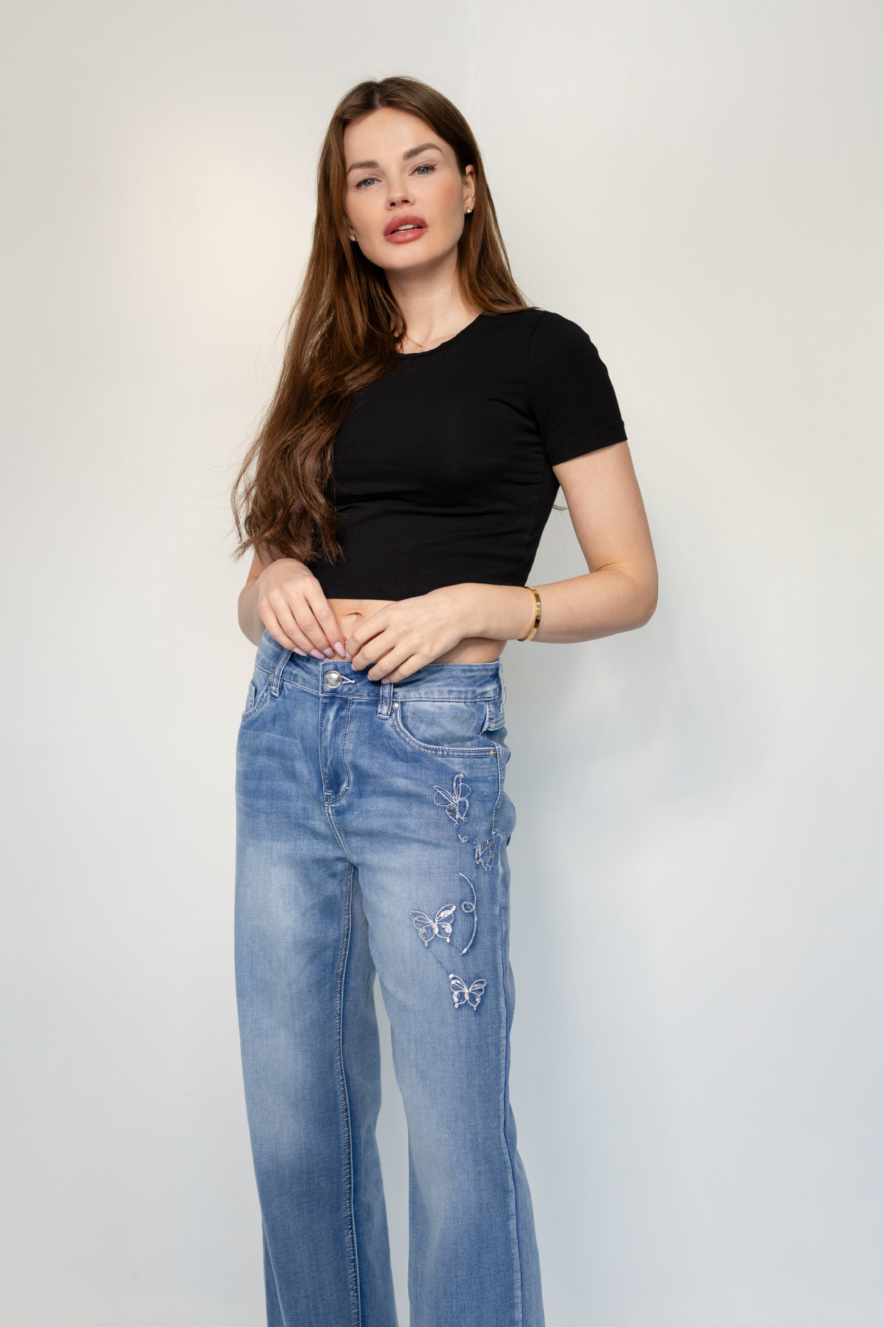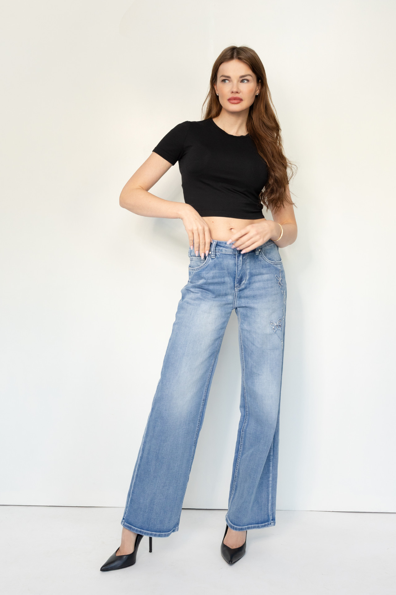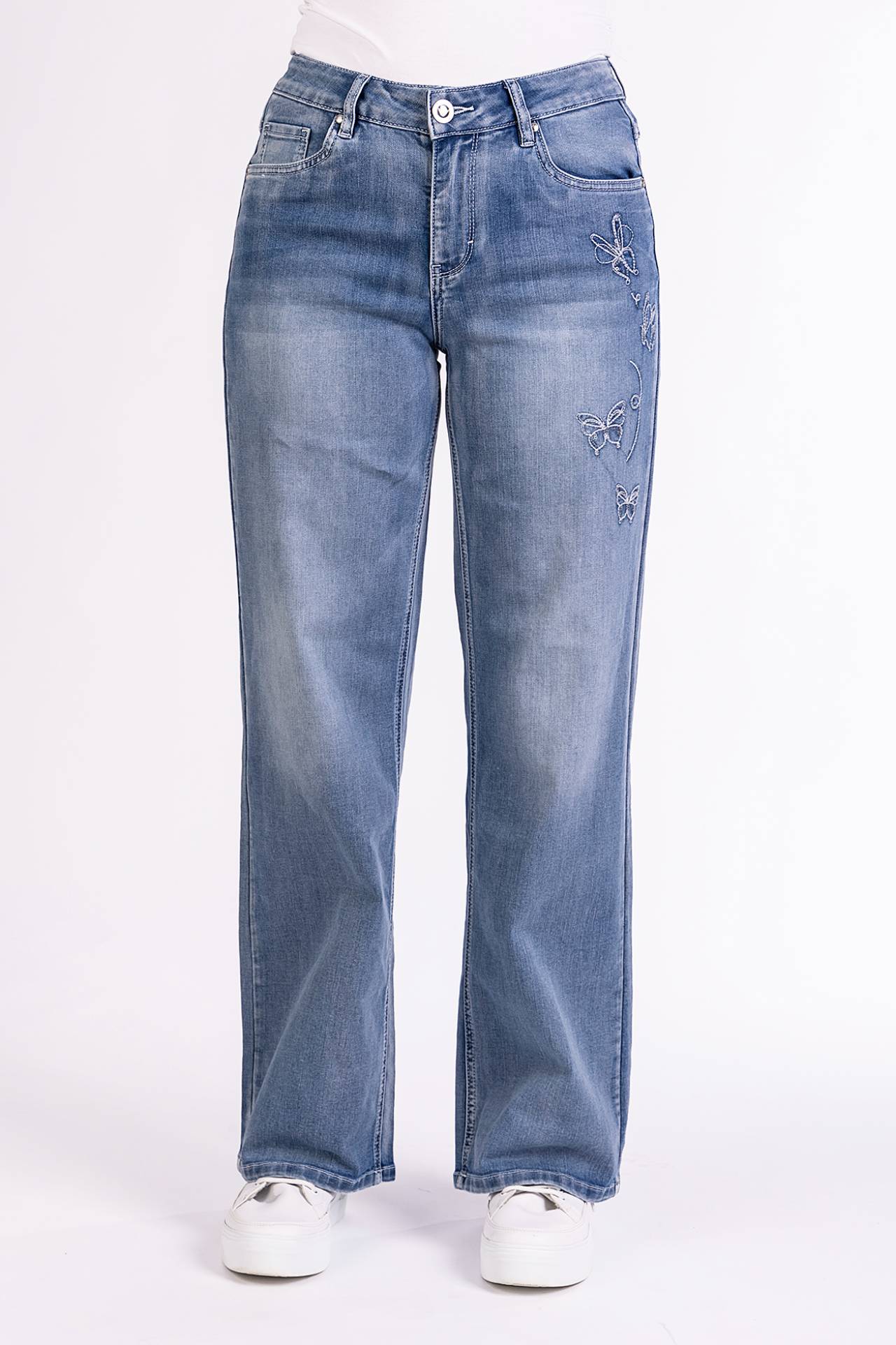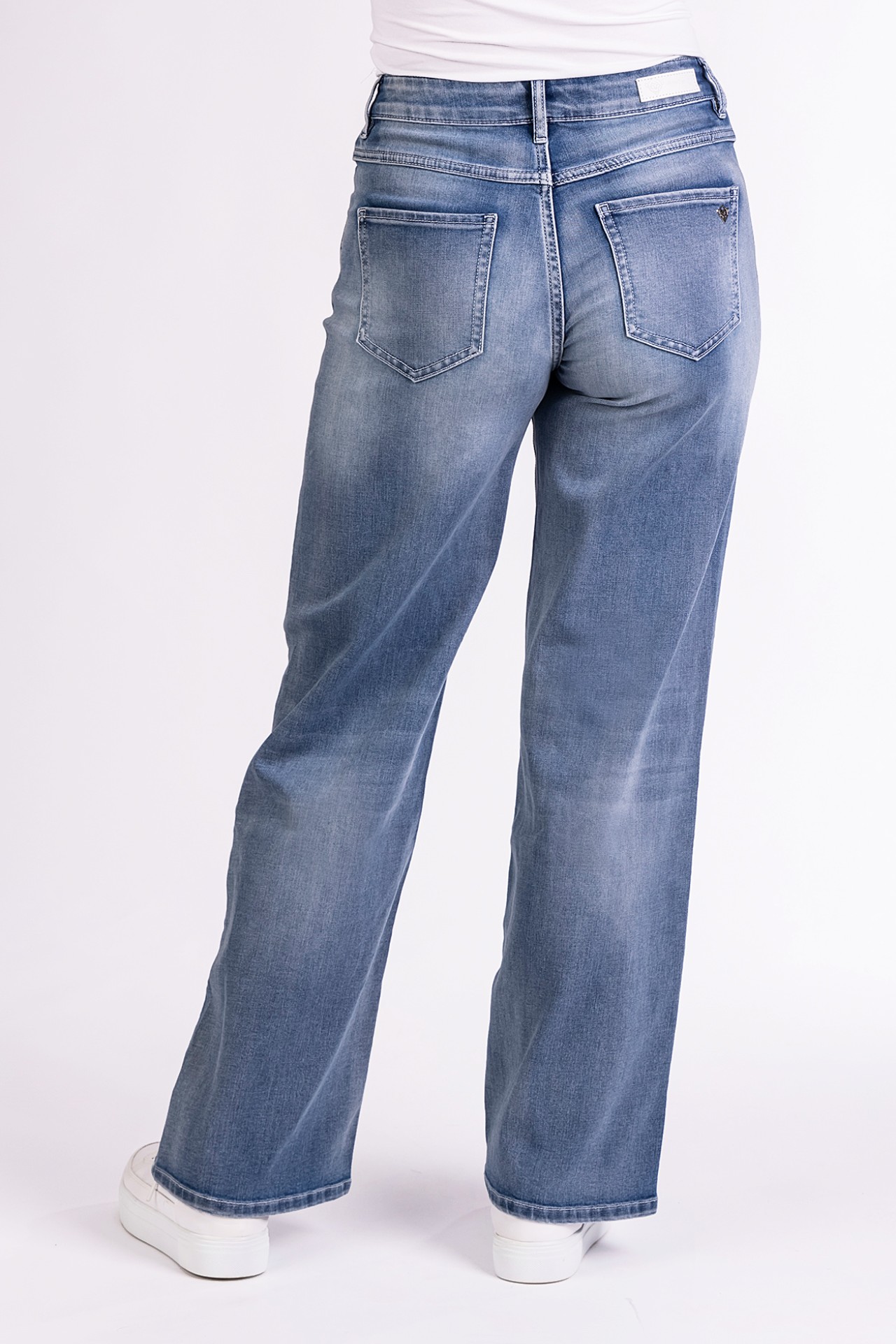 Die Blue Monkey Jeans Zoe kommt im Wide Leg Style. Sie ist eine modische 5-Pocket-Jeans mit mittlerer Leibhöhe. Der weite, gerade Beinverlauf streckt optisch das Bein und wirkt besonders figurschmeichelnd.