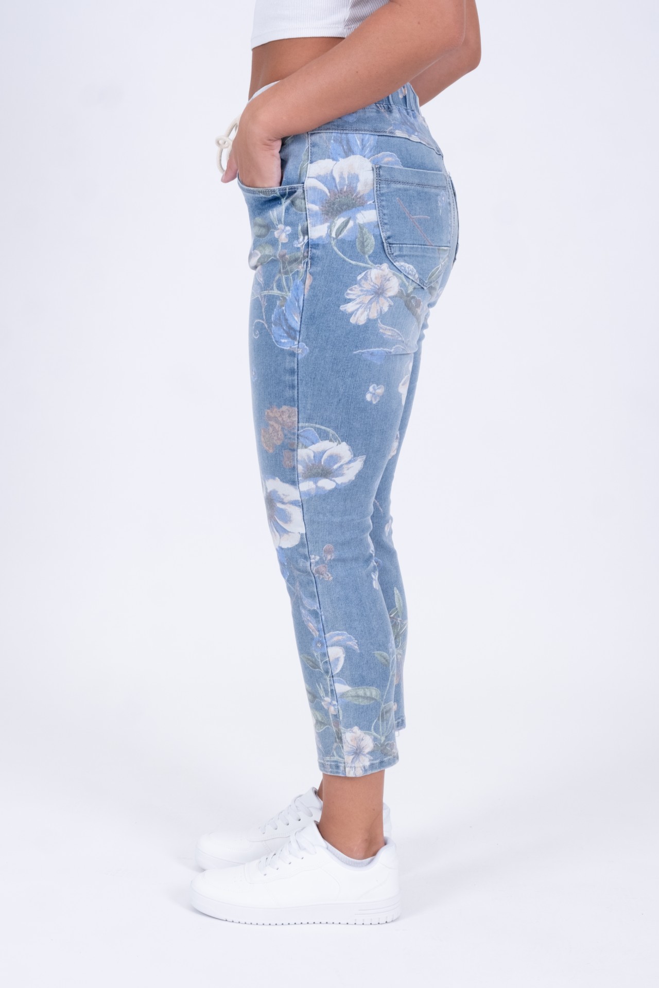 Unser Jog Style Cici mit elastischem allover Bund lässt sich super zu sportlichen Outfits stylen. Die schmale Passform und der florale Print sorgt für einen femininen Touch.