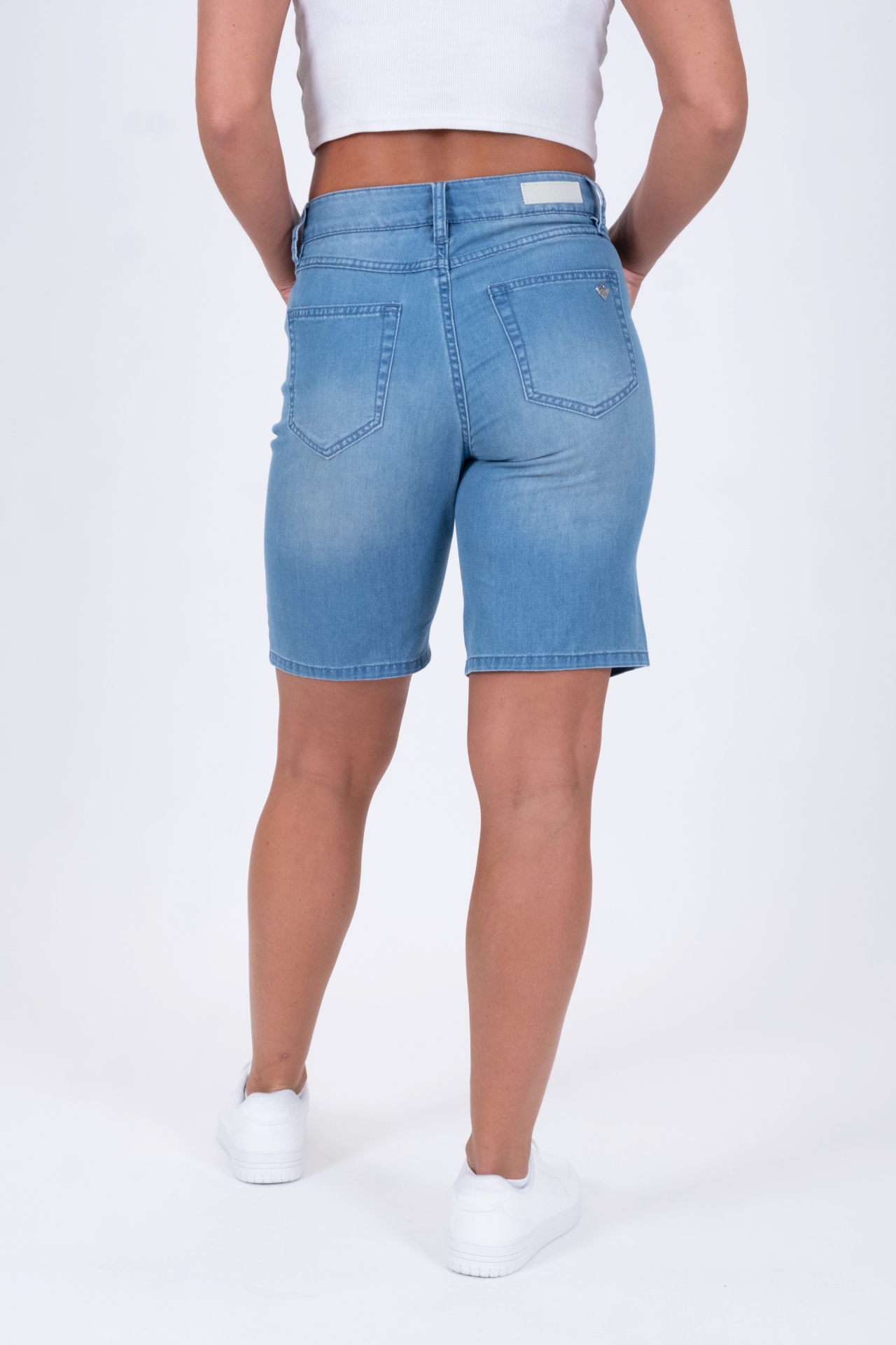 Die Denim-Bermuda Sandy in hellblauer Waschung wird durch den weiten Schnitt und Eingrifftaschen zum entspannten It-Piece für den Sommer. Die Passe und der doppelt geknöpfte Bund unterstreichen den lässigen Stil.